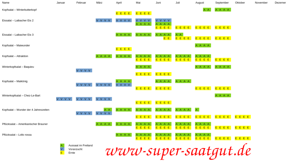 Im folgenden ein paar Aussattermine zu den Salaten Kopfsalat – Winterbutterkopf, Eissalat – Laibacher Eis 2, Eissalat – Laibacher Eis 3, Kopfsalat – Maiwunder, Kopfsalat – Attraktion, Winterkopfsalat – Baquieu, Kopfsalat – Maikönig, Winterkopfsalat – Chez-Le-Bart, Kopfsalat – Wunder der 4 Jahreszeiten, Pflücksalat – Amerikanischer Brauner, Pflücksalat – Lollo rossa